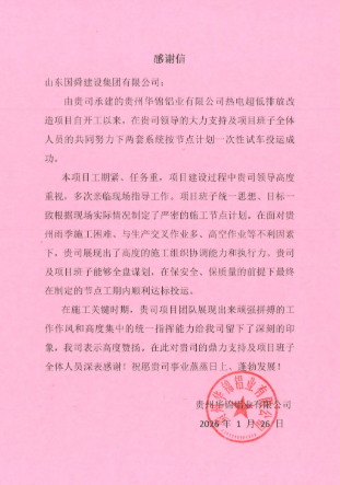 近日,豪利777集团承建的贵州华锦铝业热电超低排放改造项目两套系统,按计划一次性试车投运成功,获业主感谢信表彰,工程质量、履约效率与技术服务均获高度认可。
